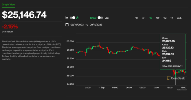 Crypto markets tumbled Monday as traders got spooked by the potential selling pressure from bankrupt exchange FTX. Bitcoin (BTC) fell more than 2% and briefly dipped to as low as $24,963 during U.S. morning hours, its first time below the $25,000 level since mid-June. It has pared some of those losses since, now trading at around $25,140, 2.6% lower in the last 24 hours.