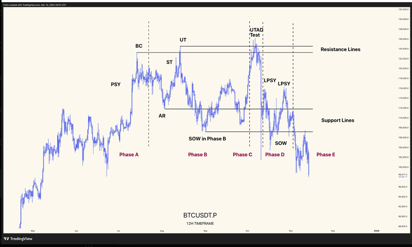 It dropped below the AR/SOW zone at $102,000–$104,000, then shifted BTC into Phase E, the markdown phase, accelerating the decline. By Friday, BTC had dropped below $95,000 on Binance.