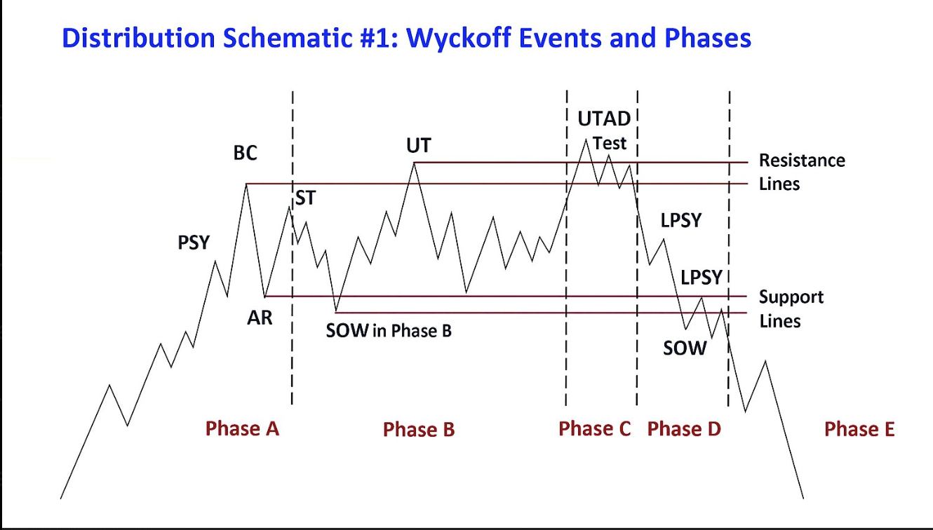BTC’s surge above $122,000 marked the Buying Climax (BC), followed by an Automatic Reaction (AR) and Secondary Tests (ST) that failed to create higher highs.