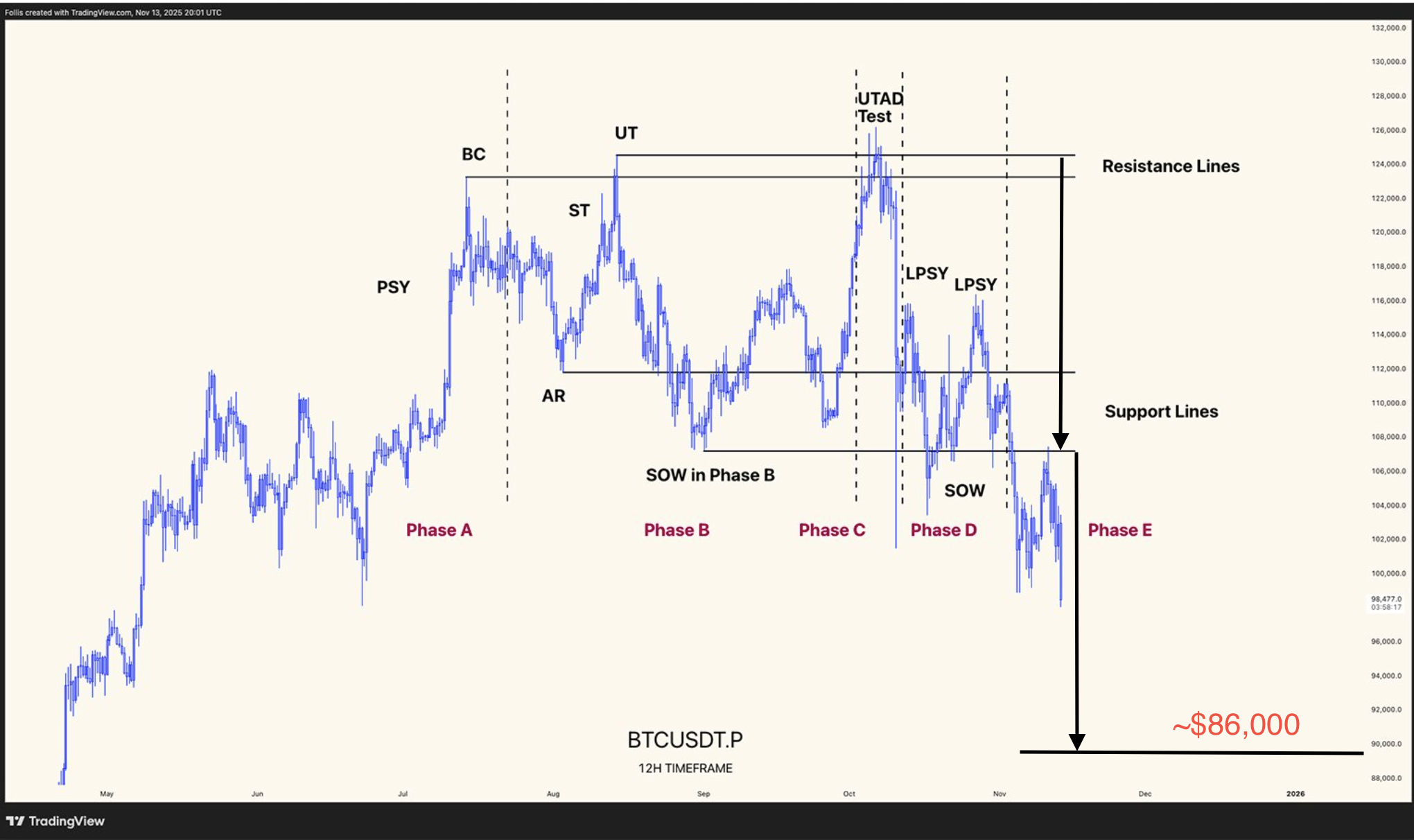 Based on Wyckoff’s measured-move method, the $122,000–$104,000 distribution band implies an $18,000 downside projection, i.e., $86,000 as the primary target.