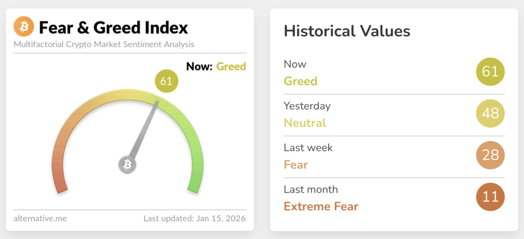 The Crypto Fear & Greed Index, which measures overall crypto market sentiment, returned to “greed” on Thursday, with a score of 61, after hovering between “fear” and “extreme fear” territory since early November.