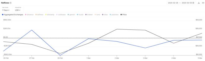 On the other hand, the metric being under the zero mark suggests the outflows are overwhelming the inflows. Generally, investors take their coins off into self-custody when they plan to hold into the long term, so such a trend can prove to be bullish for the asset.