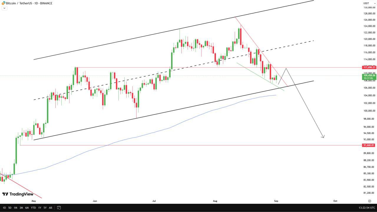 โHeavy bearish candles closed, signaling buyers are losing grip. A breakdown here could confirm the end of the uptrend โ start of a fresh downtrend.โ