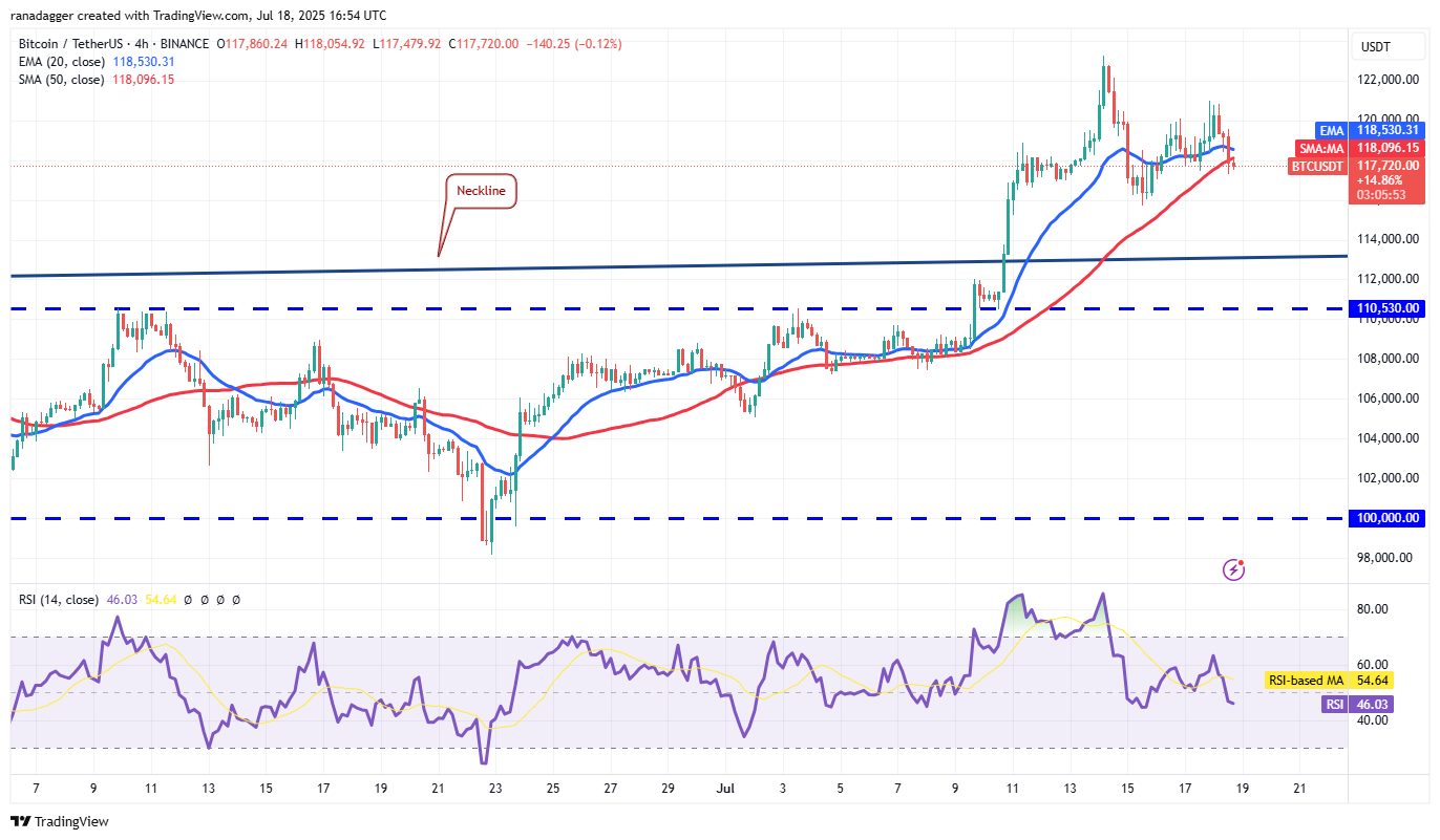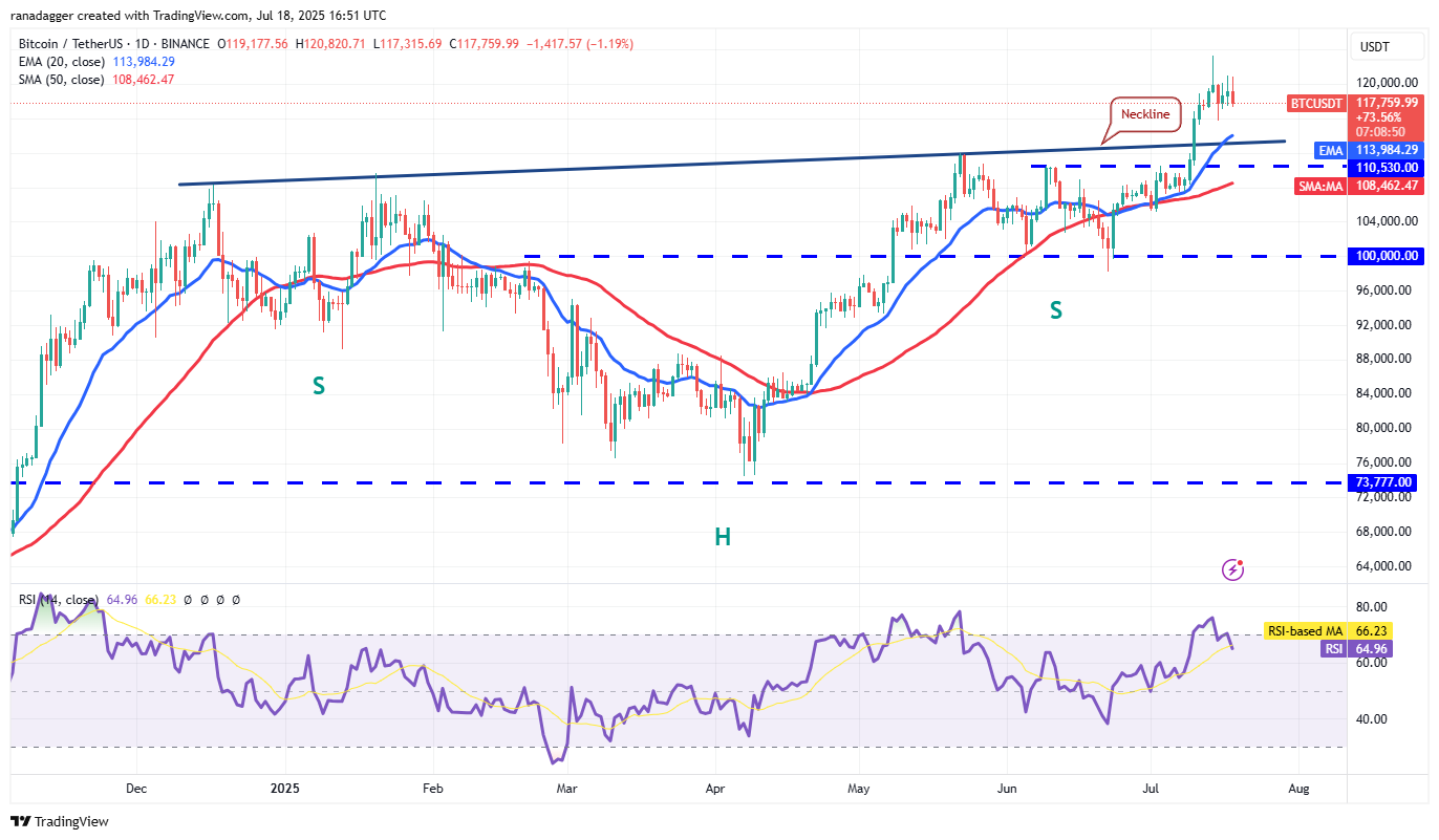 The upsloping 20-day exponential moving average ($113,984) and the relative strength index (RSI) in the positive territory indicate an advantage to buyers. If the bulls thrust the price above $123,218, the BTC/USDT pair could resume its uptrend. The pair could surge to $135,729 and thereafter to the pattern target of $150,000.