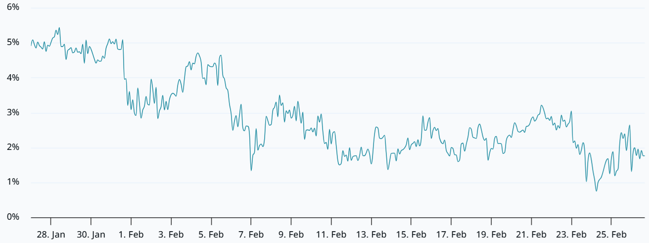 The annualized premium for Bitcoin futures relative to spot markets sat at 2% on Thursday, remaining well below the 5% neutral threshold. Bullish momentum has been largely absent since Jan. 31, the date Bitcoin surrendered the $85,000 support level after holding it for over nine months. Data from the options market further indicates that professional traders are prioritizing the avoidance of downside exposure.