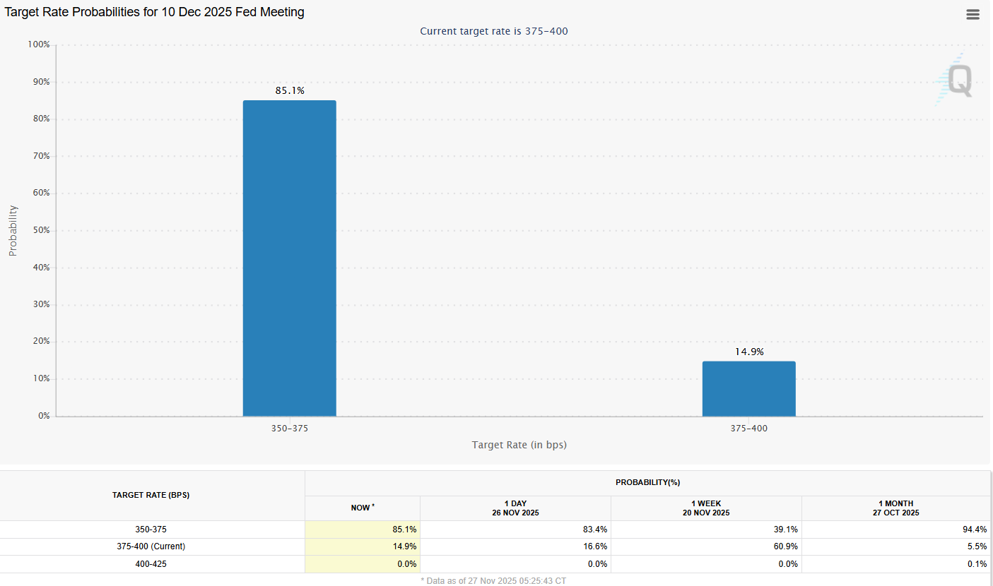 Bitcoin’s recovery follows a sharp increase in interest rate cut expectations for the US Federal Reserve’s Dec. 10 meeting, with odds increasing by 46% in a week.