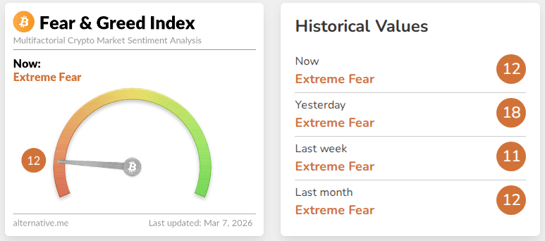 Bitcoinโ€™s slide pushed the Crypto Fear & Greed Index down six points to a score of 12 on Saturday, placing it deep in โ€œExtreme Fearโ€ territory. The index measures market sentiment across a range of factors including volatility, trading volume, and social media activity.