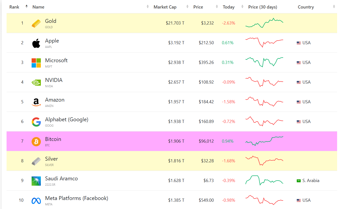 Gold is currently the world’s largest asset, valued at over $21.7 trillion. In comparison, Bitcoin’s market capitalization sits at $1.9 trillion, making it the seventh-largest asset globally, according to CompaniesMarketCap data.