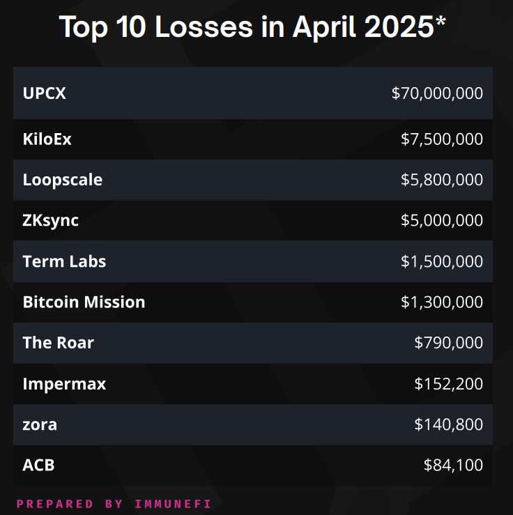 The month’s largest hack on open-source platform UPCX accounted for most of the damage in April, with over $70 million in losses, while KiloEx lost $7.5 million as April’s second-largest hack.