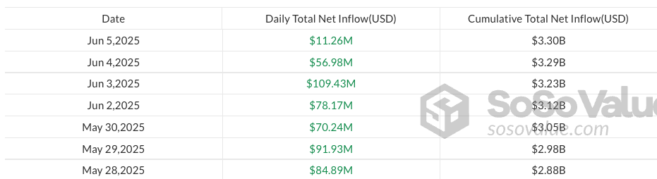 According to SoSoValue, US spot Ether ETFs saw $11.3 million of inflows on June 5, marking 14 days of consecutive inflows. On the other hand, yesterdayโs inflows were a noteworthy drop from $56.9 million of inflows on June 4 and $109.4 million of inflows on June 3.