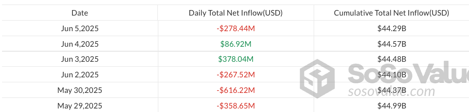 After a brief recovery on June 3 and 4, US spot Bitcoin (BTC) ETFs were again hit with outflows on Thursday, totaling $278 million, according to SoSoValue data.