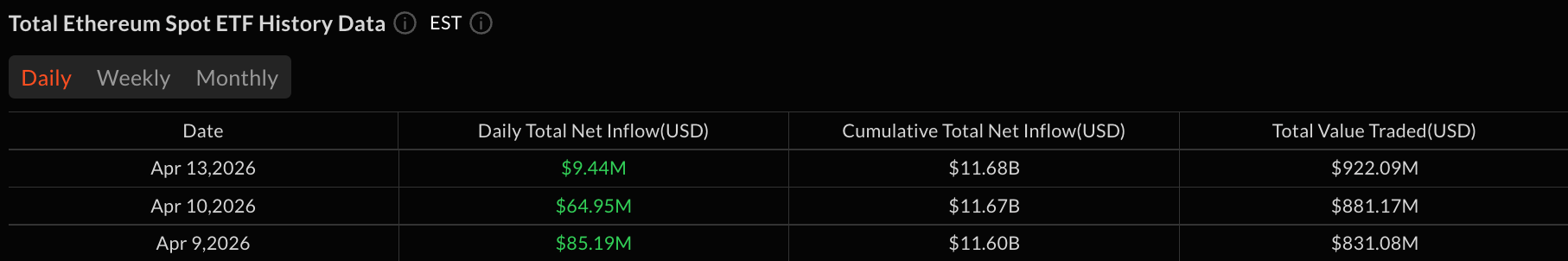 These were offset by steady inflows into other products. Blackrock’s ETHB added $5.78 million, Grayscale’s Ether Mini Trust brought in $5.15 million, and Fidelity’s FETH contributed $3.93 million. Trading volume came in at $831.08 million, with net assets closing at $12.98 billion.