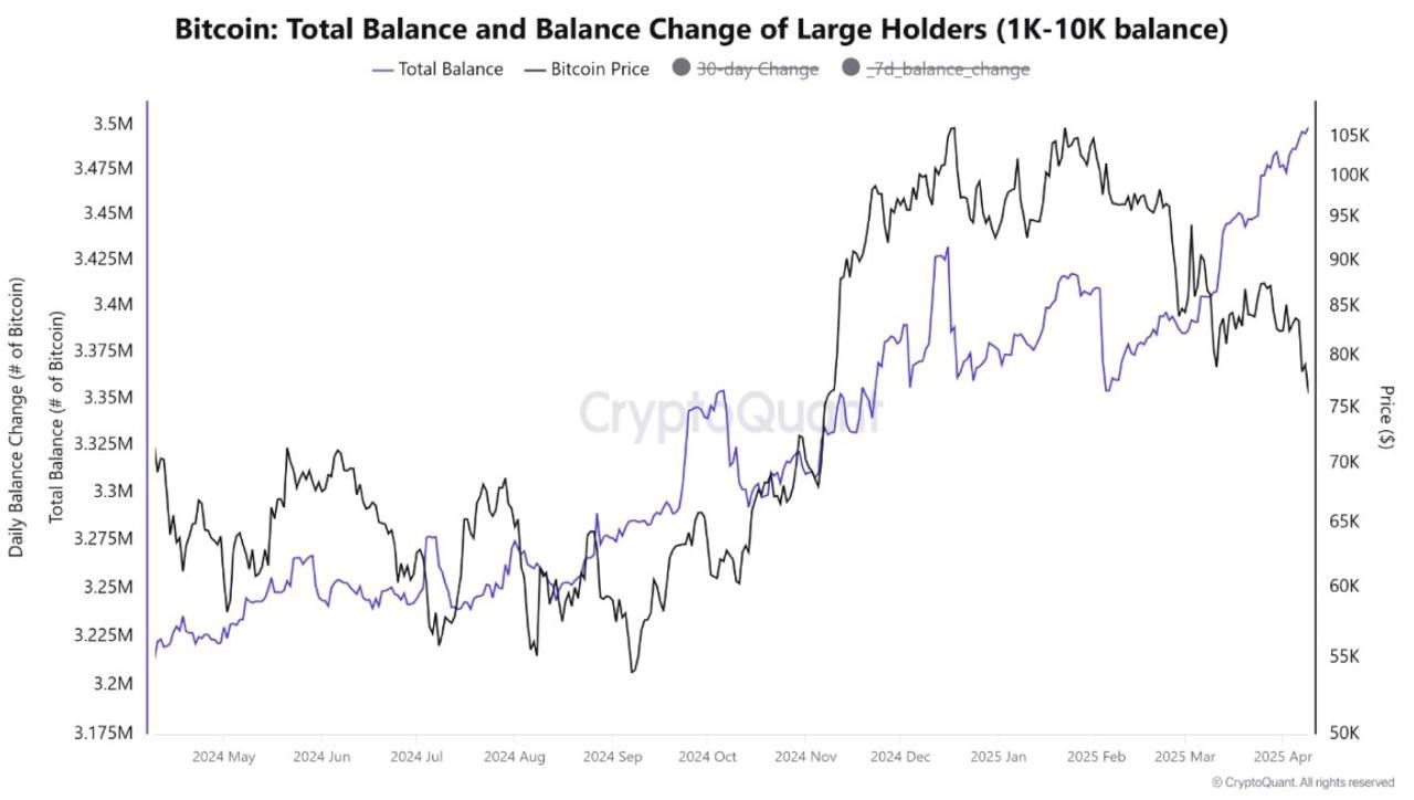 “Whales (1k-10k balance) have been accumulating hard since March, even as price slid,” crypto analyst Miles Deutscher noted on X this week alongside CryptoQuant data.