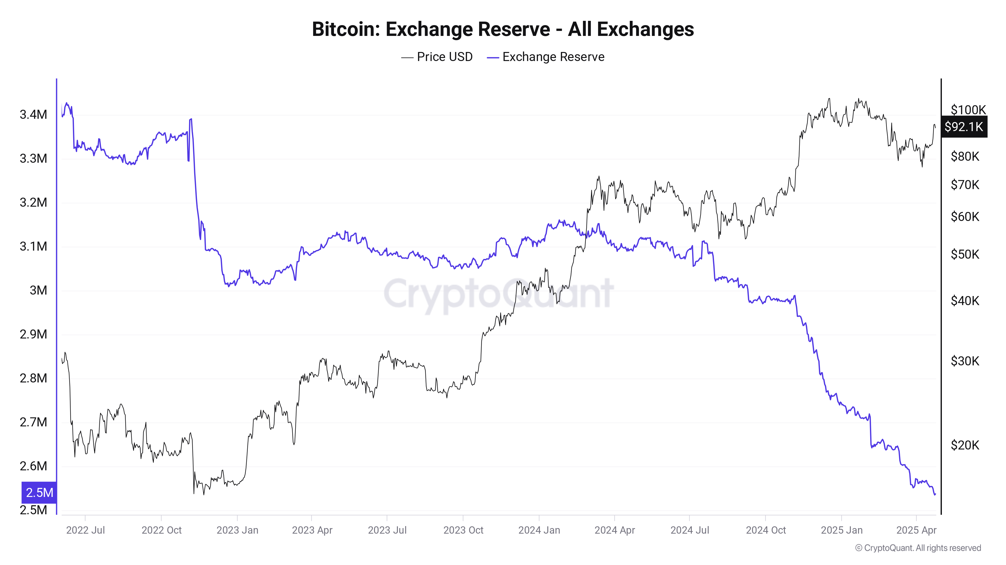 CryptoQuant shows reserves hitting 2.535 million BTC in early April, down over 7% from 2.740 million BTC at the start of the year.