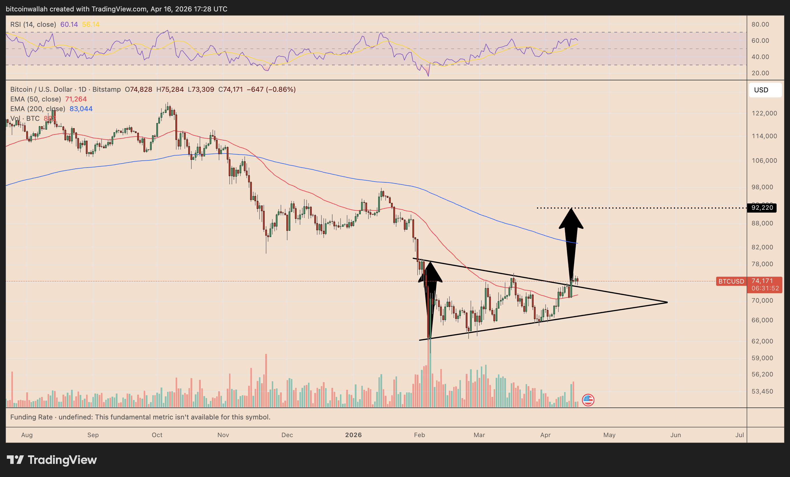 BTC broke out of its symmetrical pattern setup with a measured target at around $92,220.