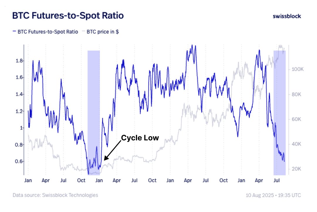 The ratio of leveraged futures to spot buying is circling lows not seen since the pit of Bitcoin’s last bear market in late 2022.