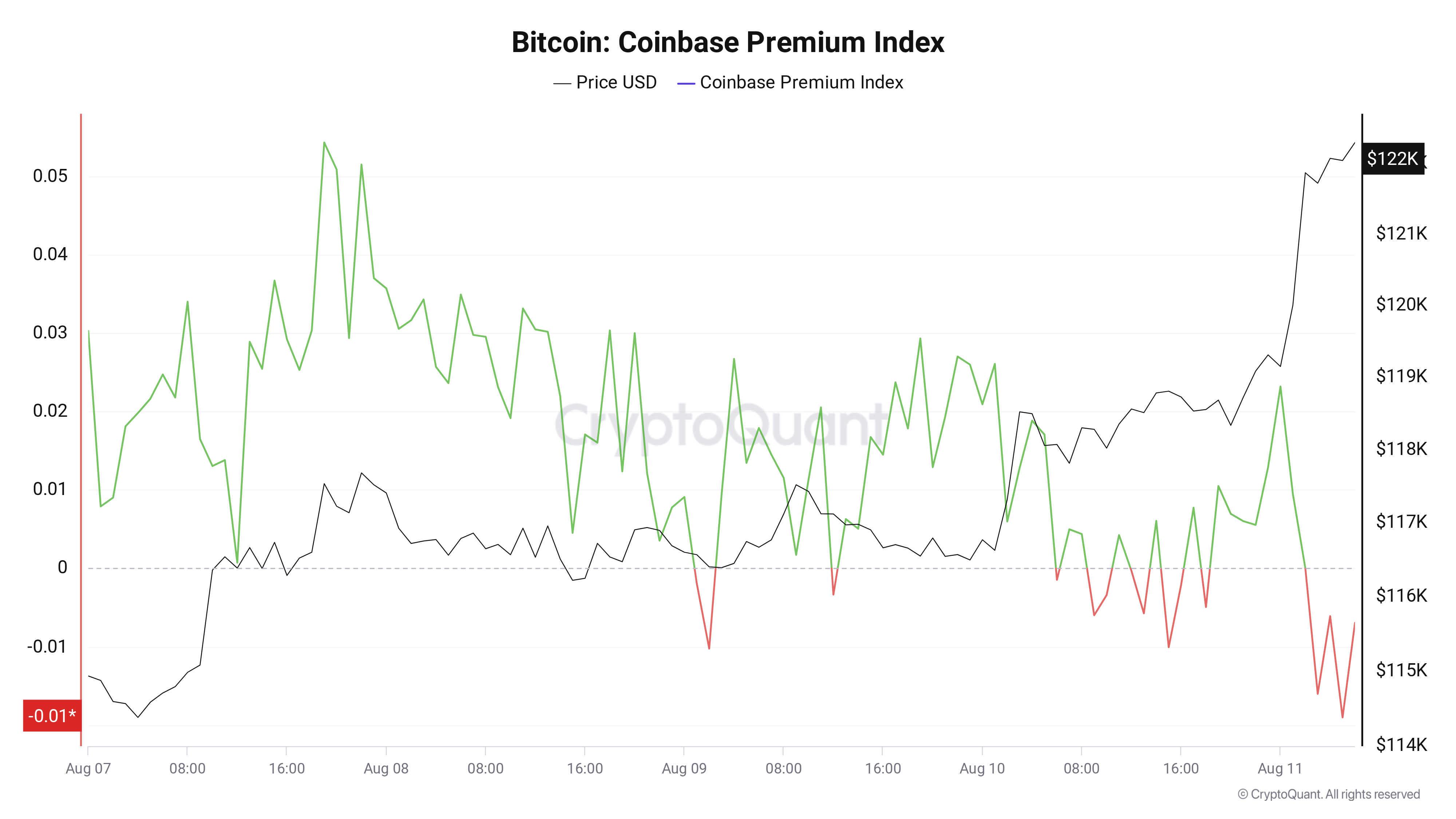 “Price jumped from $118K to $122K earlier today as investors piled in. But the Coinbase Premium Index flipped red right after.”