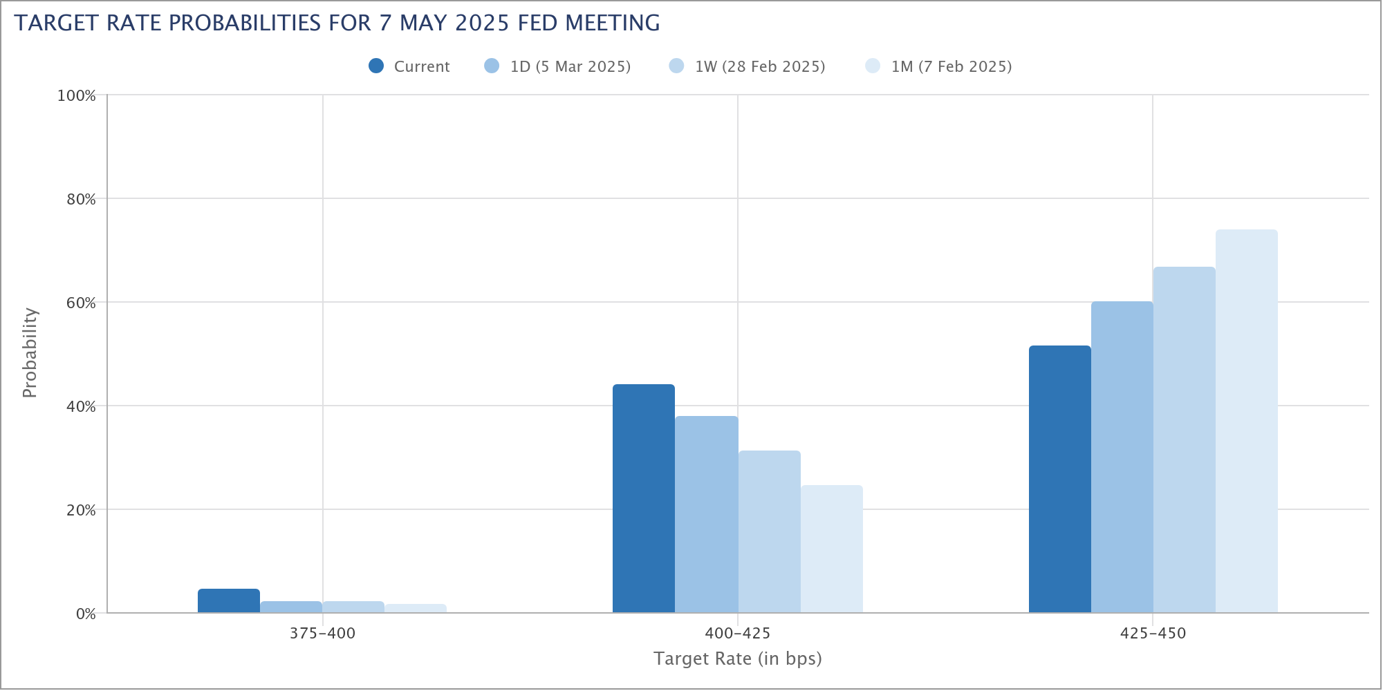 The latest data from CME Group’s FedWatch Tool shows 11% odds of a cut at the Fed’s March meeting, with these much higher for its May meeting — almost 50%.