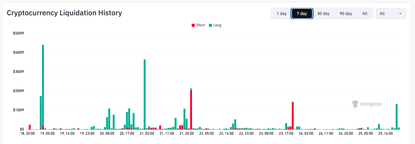 Long positions made up the majority of 24-hour crypto liquidations, which passed $250 million, per data from CoinGlass.