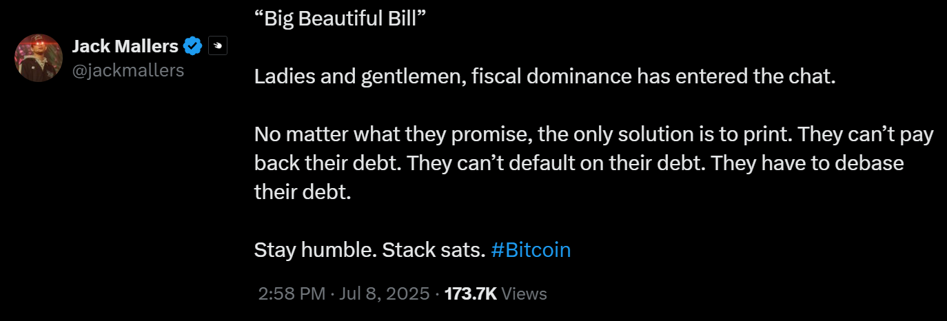 Jack Mallers, co-founder and CEO of Strike, noted on X that the only viable option for the US Treasury is to expand the monetary base—an action akin to printing money. Mallers argues that the government is unlikely to default on its debt, meaning debasement becomes the final resort. This, he suggests, creates an ideal environment for a Bitcoin rally.