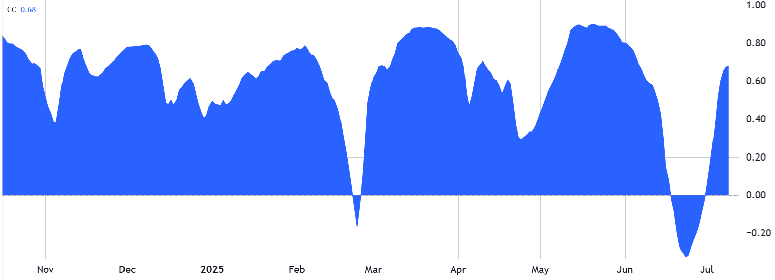 The correlation between Bitcoin and the S&P 500 stands at 68%, meaning both asset classes have presented similar price trends. The ongoing US import tariffs are another risk factor, potentially hurting corporate earnings, especially in the tech sector, which is heavily reliant on global trade.