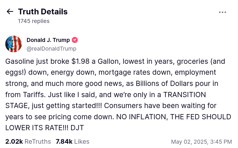 โConsumers have been waiting for years to see pricing come down. NO INFLATION, THE FED SHOULD LOWER ITS RATE!!!โ part of the post stated, referencing various inflation markers.