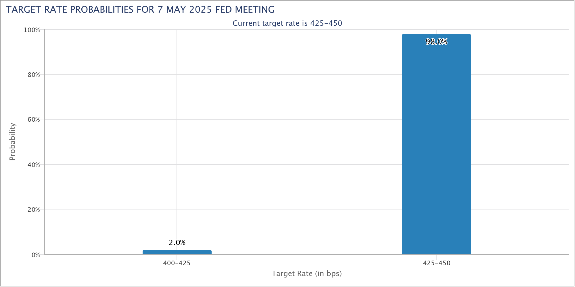 As Cointelegraph reported, the Fedโs next decision on rates will come on May 7, with markets overwhelmingly seeing no change to the current regime. The latest data from CME Groupโs FedWatch Tool puts the odds of a cut next week at just 2%.