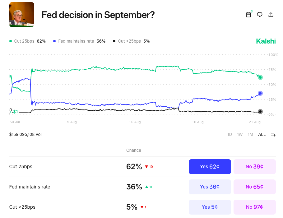 The odds of no cut coming rose to 36% on prediction service Kalshi — the most since Aug. 1, trading resource The Kobeissi Letter noted.