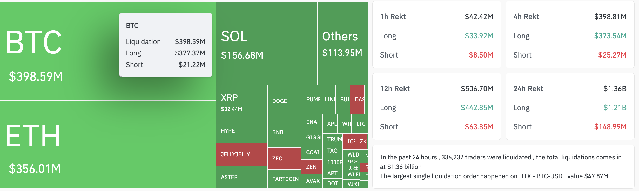 More than $1.21 billion in long positions were liquidated, with Bitcoin accounting for $377 million of that total. Ether (ETH) followed with $316.6 million in long liquidations.