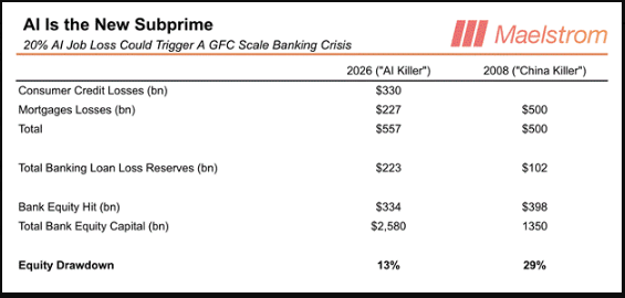 This is a dramatic chain of events: AI job losses lead to credit losses, which cause bank stress, which forces the central bank to expand money supply, which lifts Bitcoin.