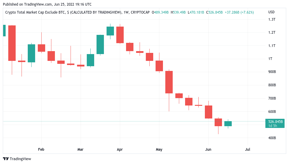 On the weekly basis, the altcoin market cap was up $37 billion over the week, set for its first green candle since March.