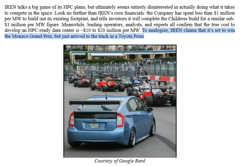 Culper compared IREN’s efforts to competing to win the Monaco Grand Prix, but arriving at the track in a Toyota Prius.