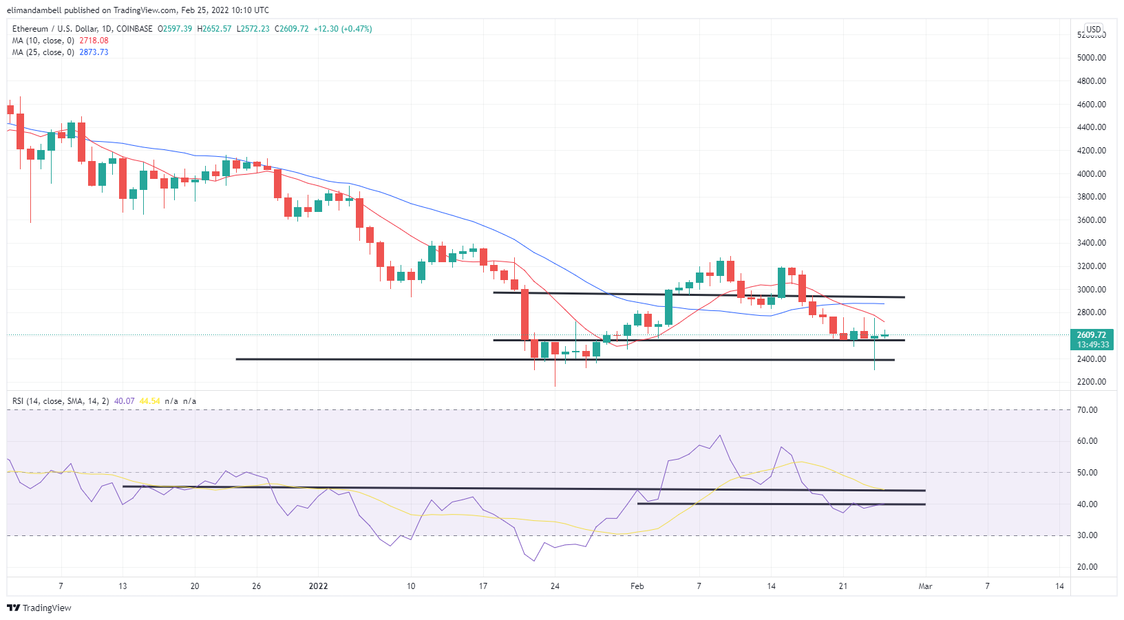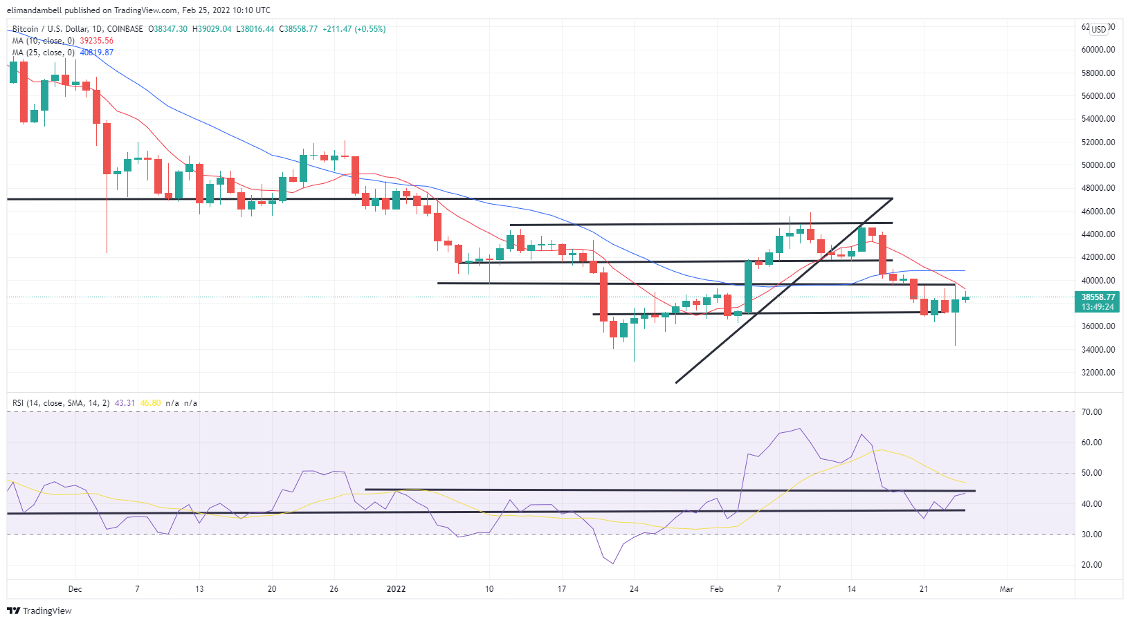 Following Russia’s invasion of Ukraine, volatility in bitcoin and ethereum prices intensified, with both falling to one-month lows on Thursday. Both have since moved away from these lows so far today, in what looks like temporal consolidation.