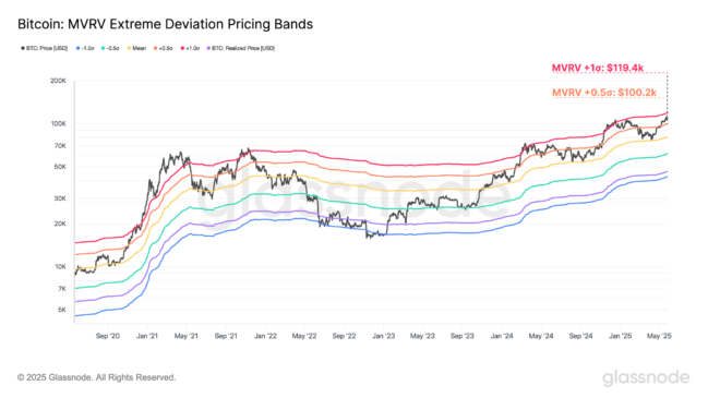The level that BTC is yet to surpass in this latest rally is the +1 SD one, located at $119,400. From the chart, it’s visible that the cryptocurrency breaking above this line has generally led to a top for its price.