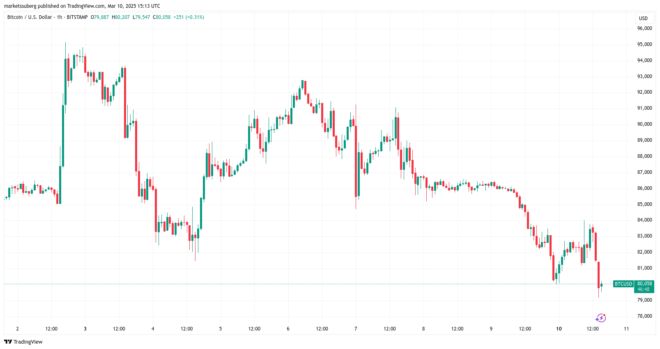 Data from Cointelegraph Markets Pro and TradingView showed BTC/USD down around 4% on the day to reach $79,170 on Bitstamp.