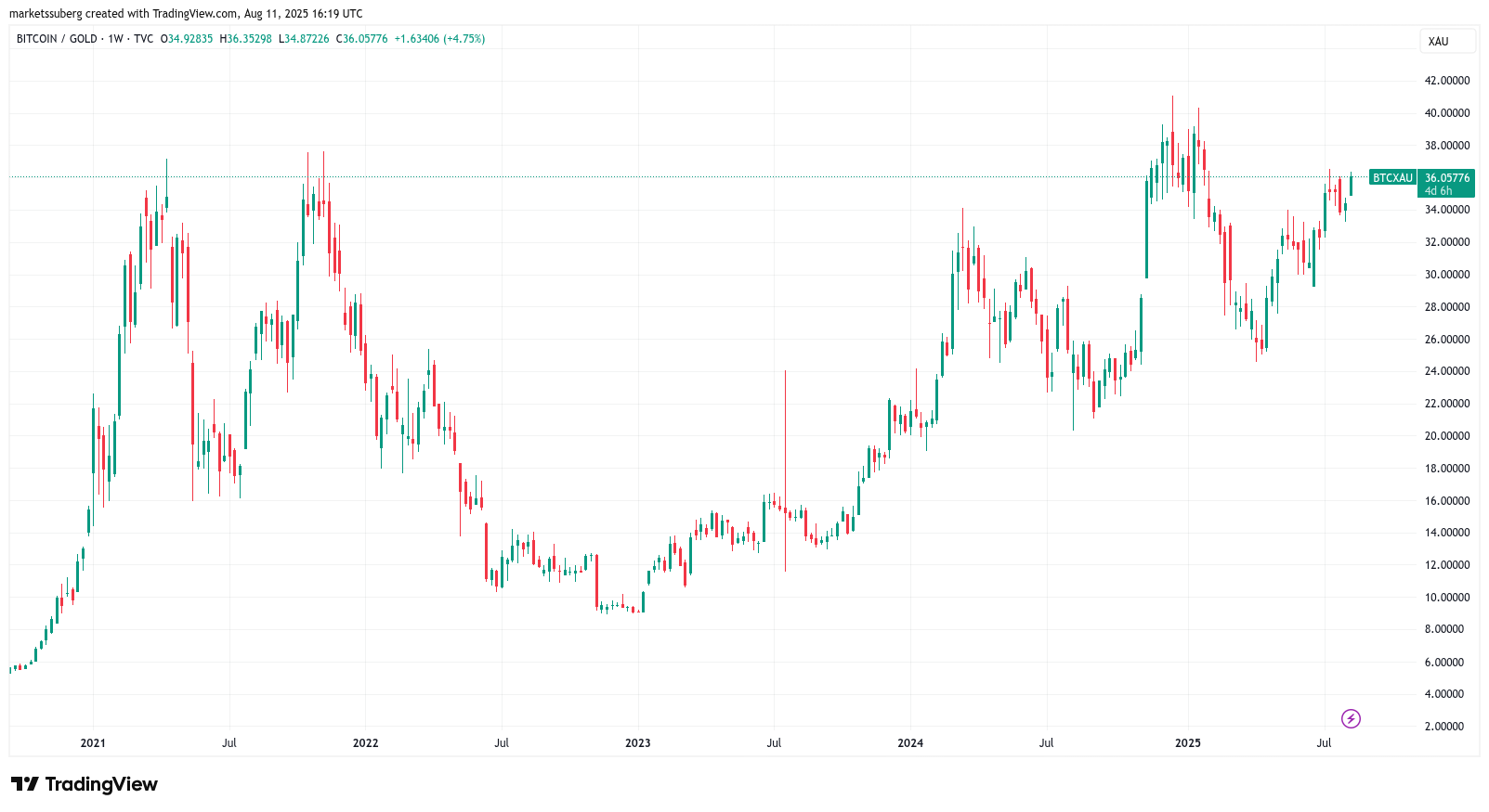 A subsequent bull run on gold sent BTC/XAU down 40% before a rebound, with 1 BTC now worth around 36 ounces.