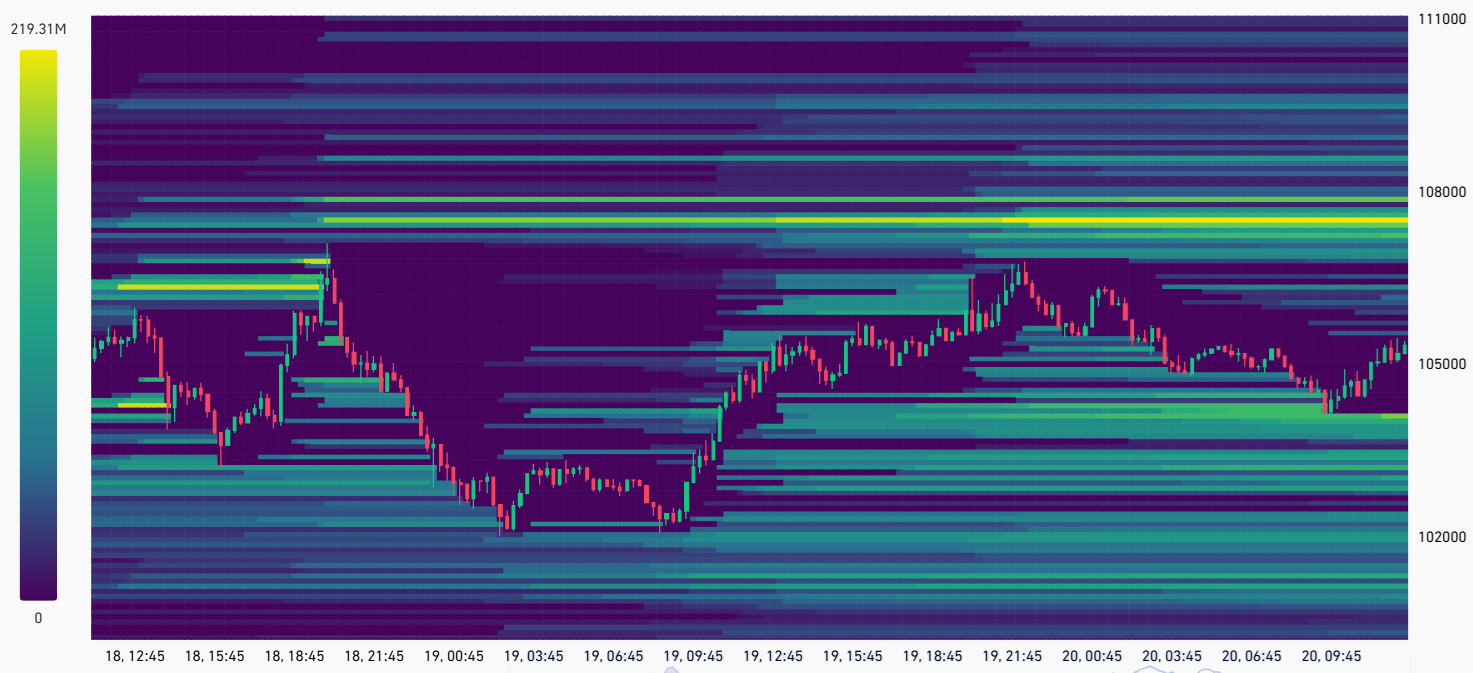 According to CoinGlass estimates, the largest concentration of bearish BTC futures liquidations is clustered between $107,000 and $108,000, amounting to approximately $1.2 billion.