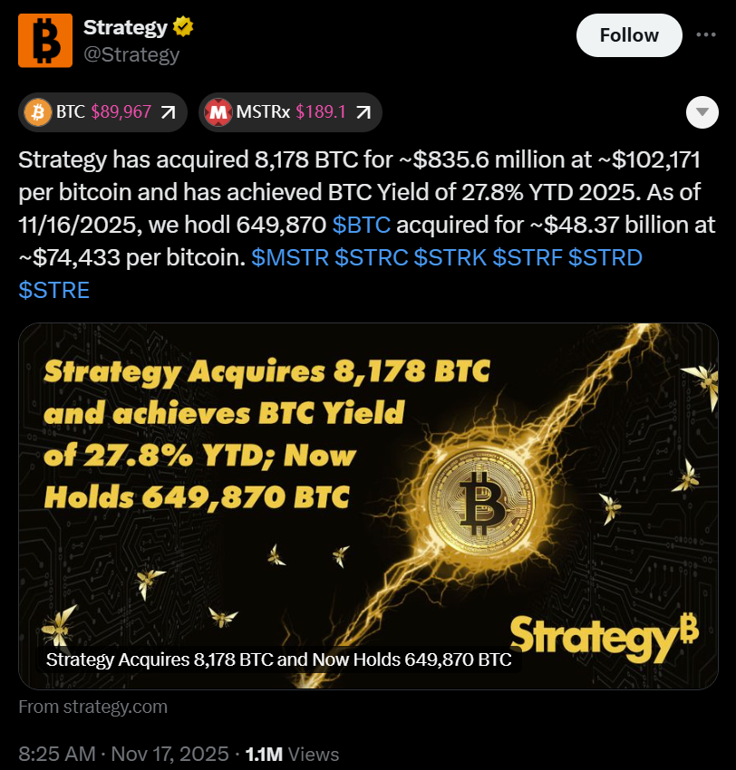 Business-intelligence-company-turned-Bitcoin-treasurer Strategy made headlines this week after announcing it had acquired an additional 8,178 BTC for $835.6 million, at an average price of $102,171 per Bitcoin. It marks the company’s largest purchase since July.