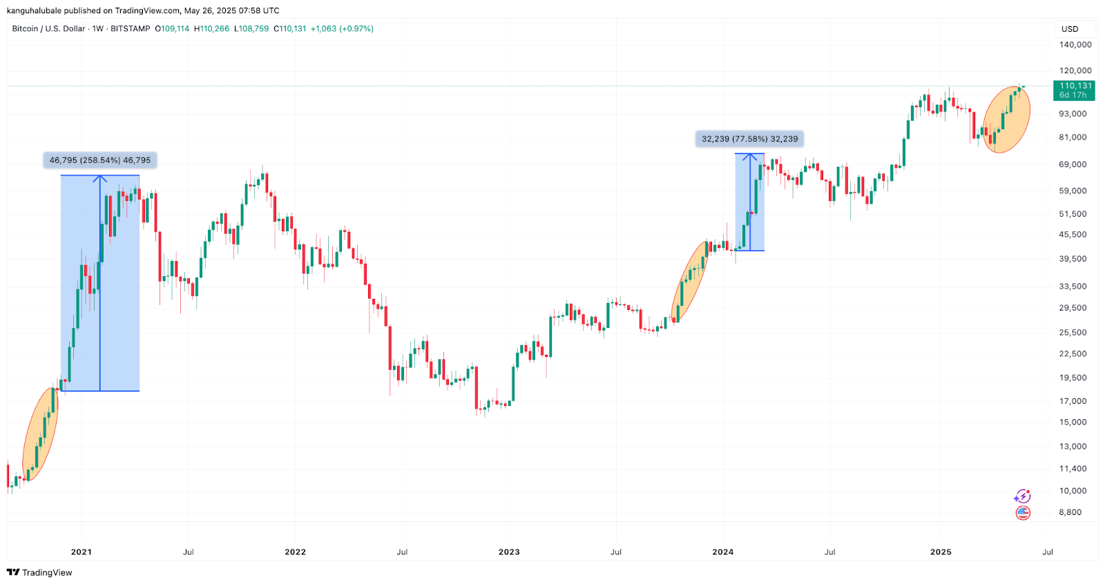 BTC’s close above $109,000 on May 25 was the seventh consecutive bullish weekly close, as shown in the chart below.