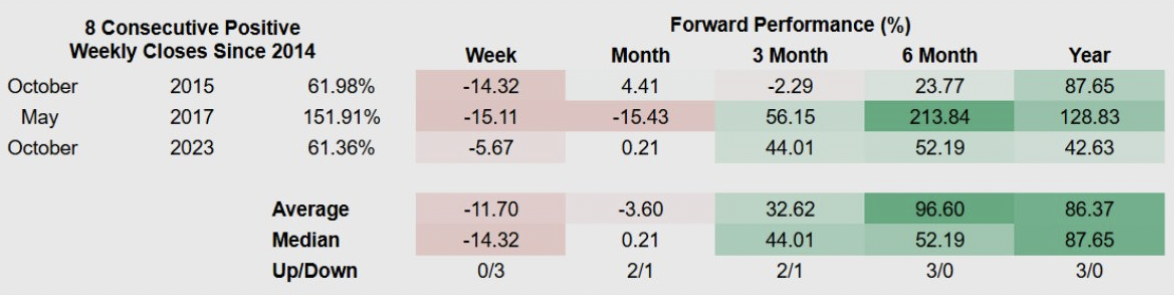 “Following eight consecutive positive weekly closes, the market has historically been negative one week later, but has always been positive 6 months and 1 year later.”