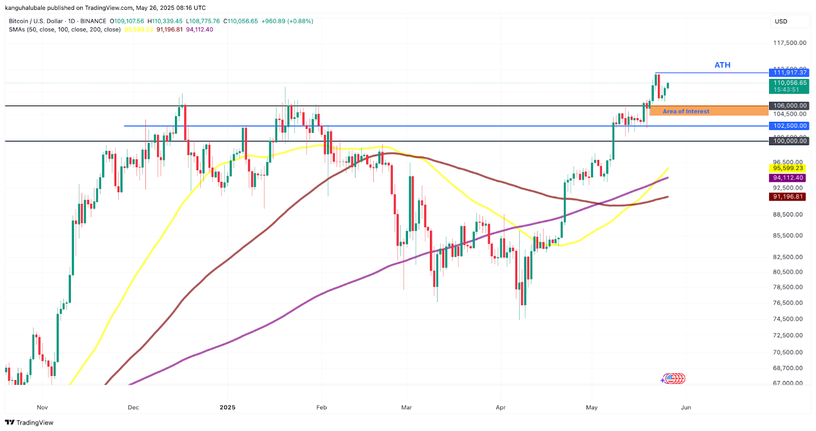 Data from Cointelegraph Markets Pro and TradingView revealed that BTC rose by as much as 3.2% to an intraday high of $110,100 on May 26 from a low of $106,660 on May 25.