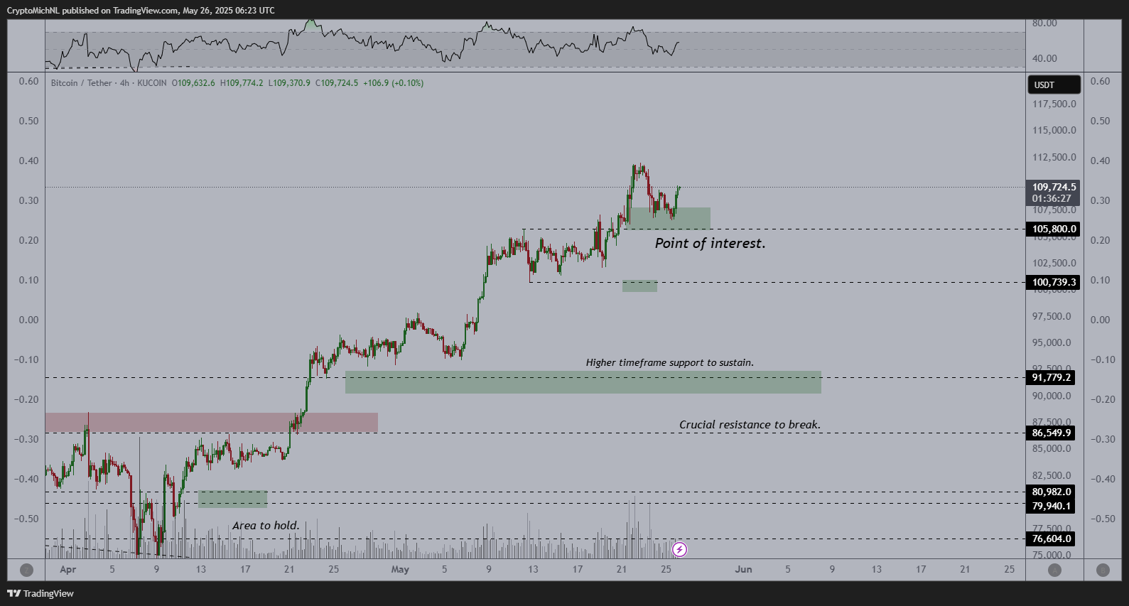 MN Capital founder Michael van de Poppe pointed out that if Bitcoin continued “holding on to the point of interest” between $105,500 and $107,000, it could see fresh all-time highs over the next few days.