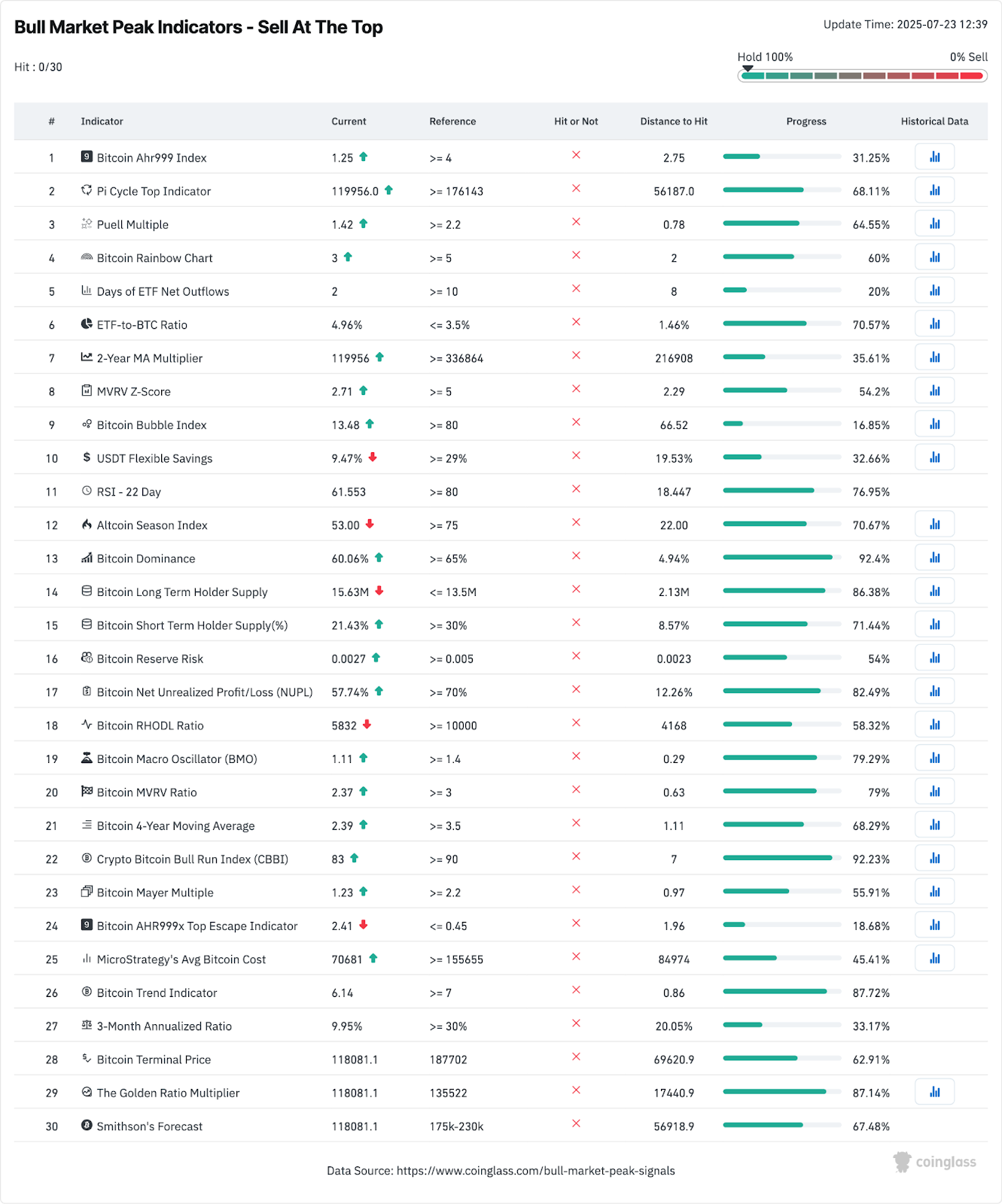 “0 out of 30 top signals have triggered on CoinGlass’s Bitcoin Bull Market Peak Dashboard,” popular analyst CryptosRus wrote in an X post on Monday.