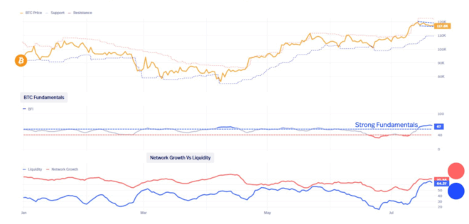 The Bitcoin Fundamental Index (BFI) remains strong, reflecting rising network growth and liquidity, as shown in the chart below.