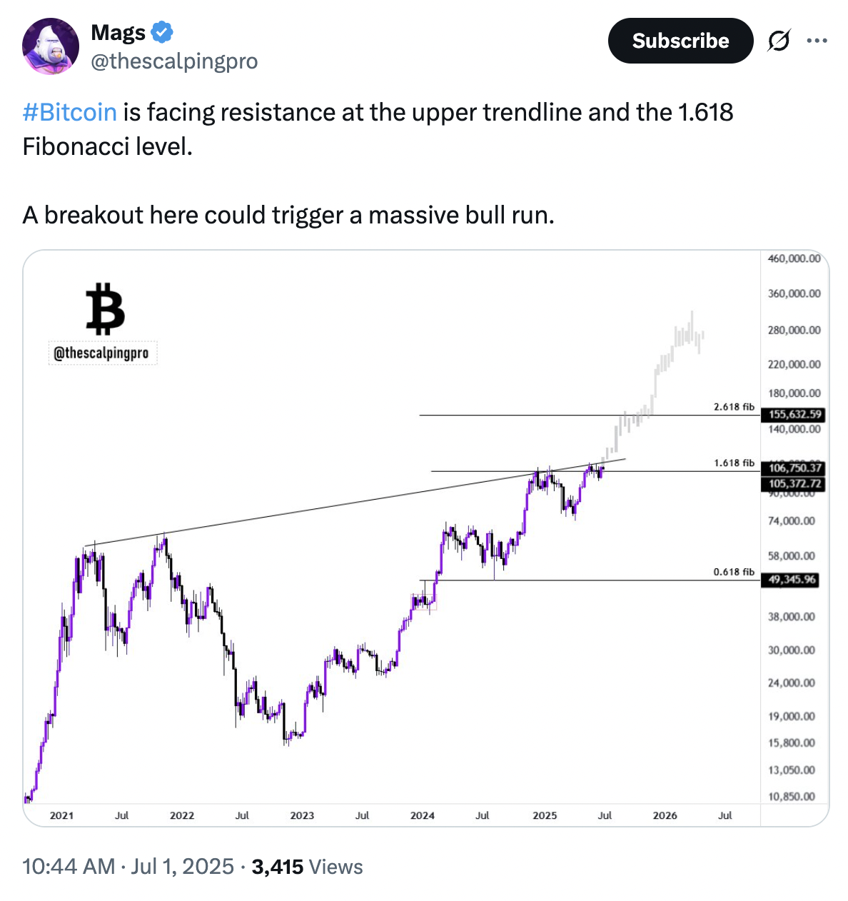 Analyst Mags said Bitcoin’s breakout above the same upper trendline as Stockmoney Lizards’ “could trigger a massive bull run.” Mags’ short-term target is the 2.618 Fibonacci level at $155,000.
