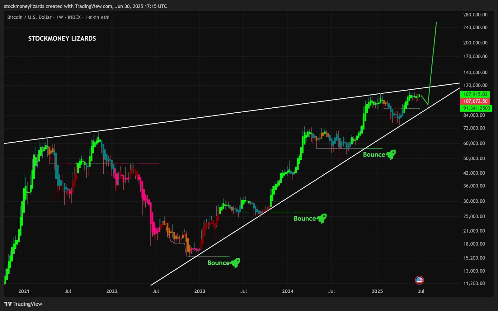 In November 2022, Bitcoin bounced from the bear market bottom at $15,500, staging a 590% rally to the current price of about $107,000. This price action has seen higher highs and higher lows, forming a channel in the weekly time frame, according to analyst Stockmoney Lizards.