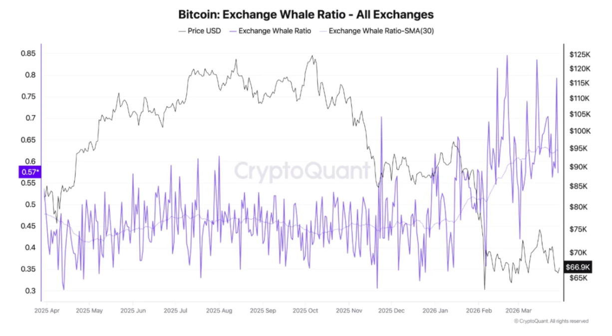 CryptoQuant noted increasing whale presence among exchange inflows, with their wallets accounting for more of the largest inbound transactions.