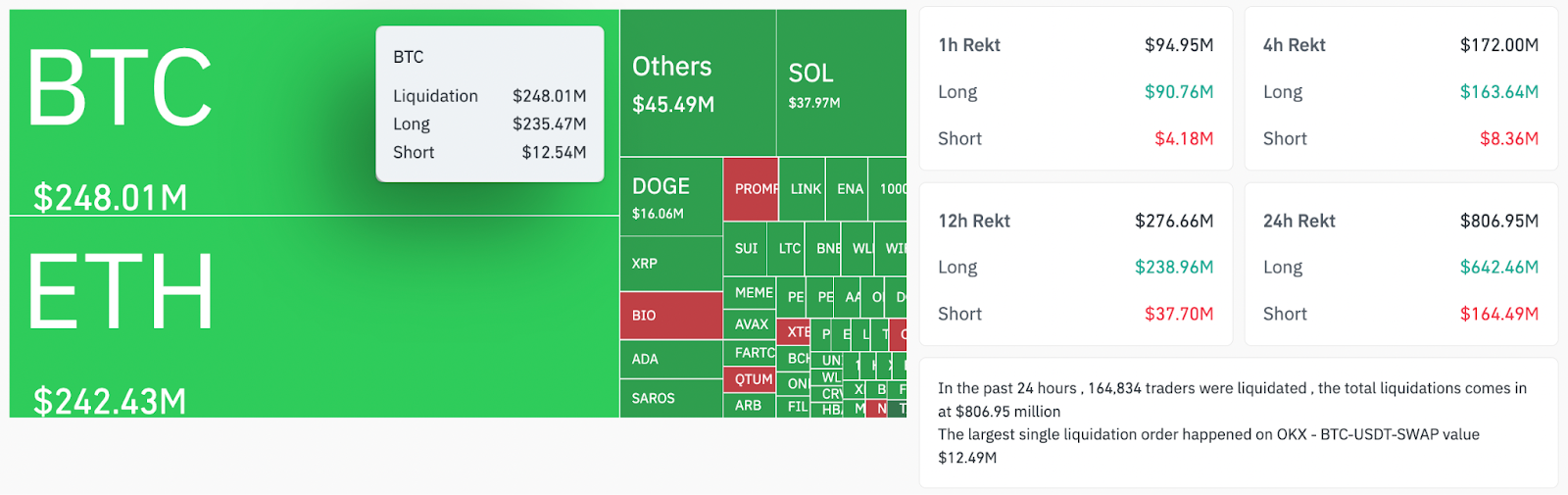 Across the board, a total of $806.95 million was wiped out of the market in short and long positions, as shown in the figure below.
