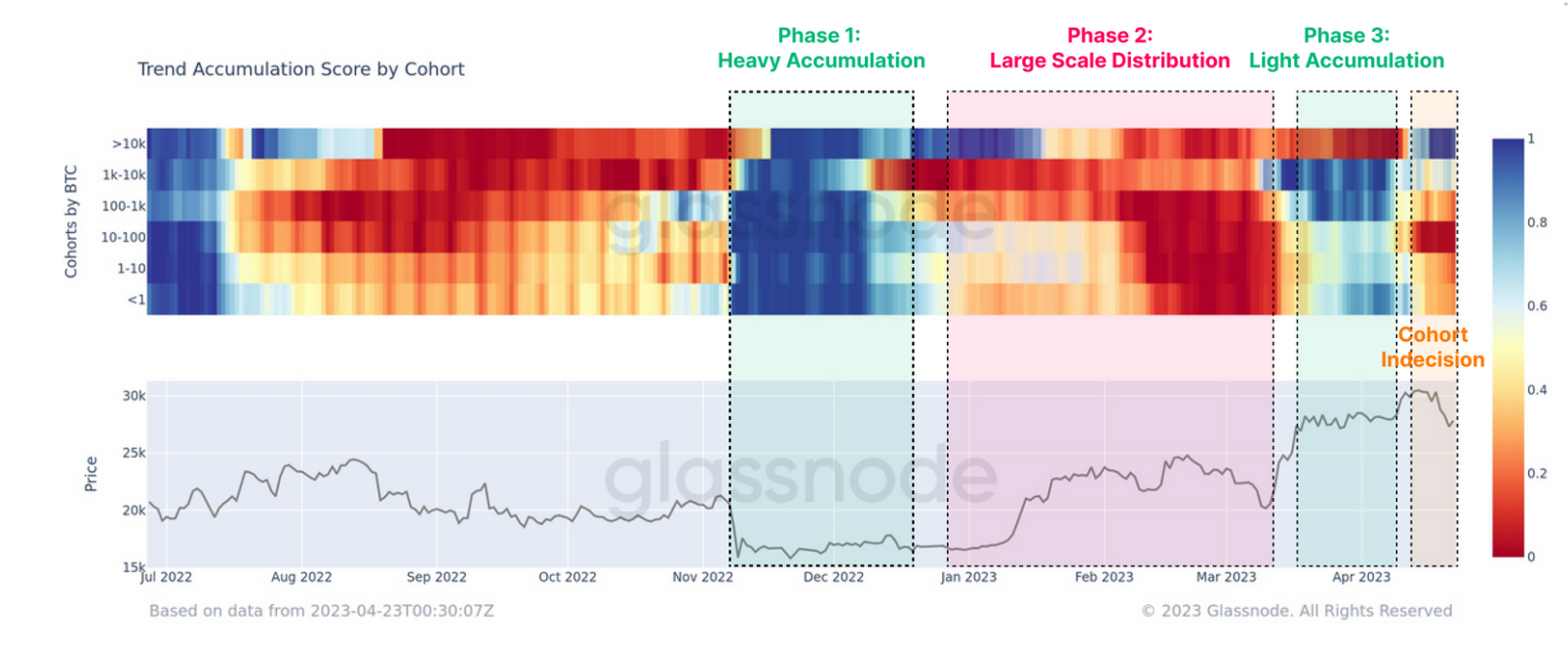 โWith accumulation and distribution behavior across several wallet cohorts mixed at the moment, the market appears less decisive than it has been in the first quarter of the year.โ