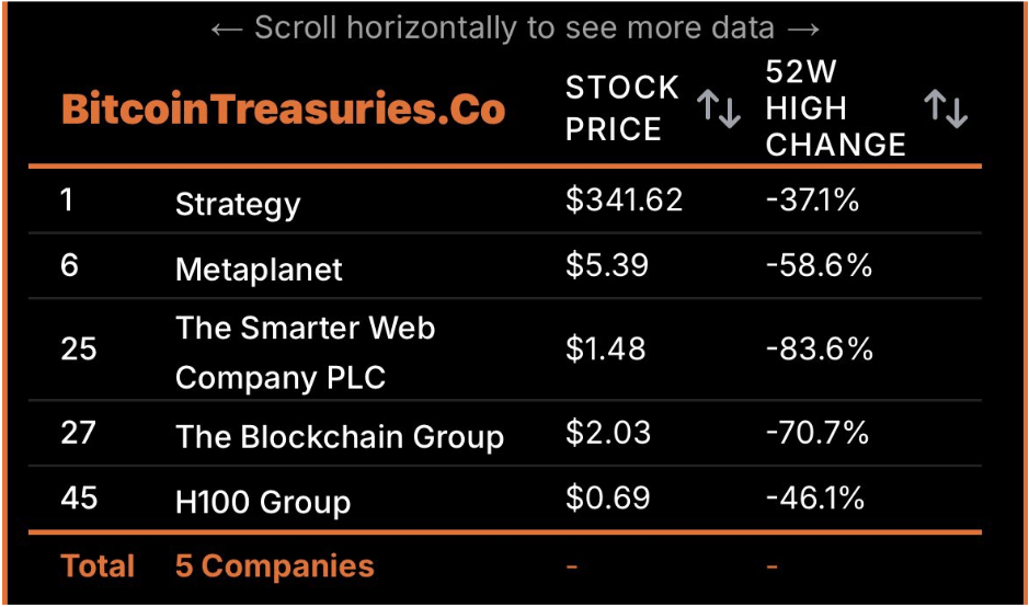 At the time of writing, Bitcoin is in a correction phase and is struggling to hold above the $110,000 support level. Popular BTCTC stocks are also struggling with downtrends alongside Bitcoin. Strategy’s stock is down 37.1% from its 52-week high, while MetaPlanet is down 58.6%. Others, like The Smarter Web Company PLC (-83.6%) and The Blockchain Group (-70.7%), are at greater losses.